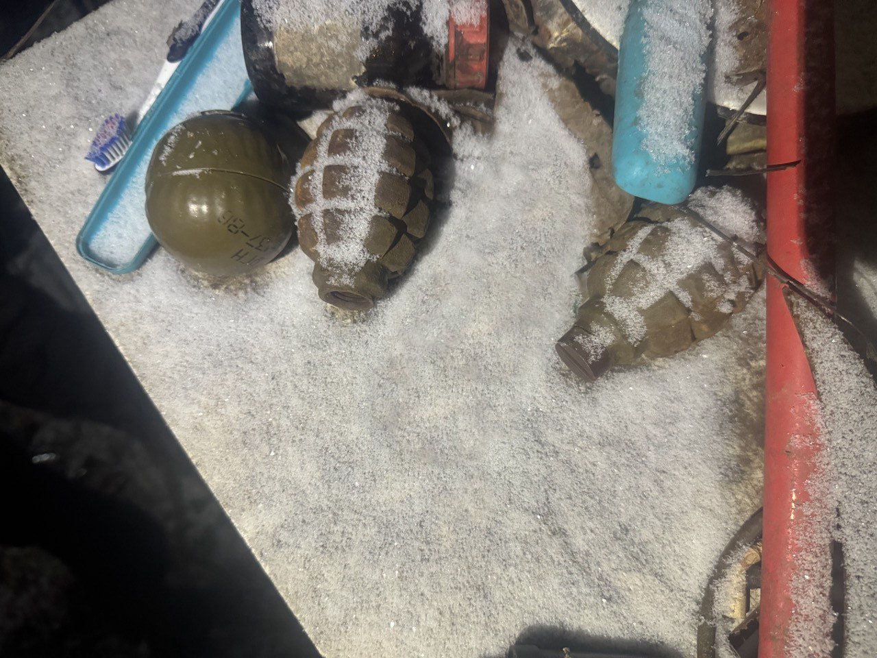 В ходе обыска, проведенного на территории домовладения 56-летнего подозреваемого, оперативники обнаружили и изъяли 3 предмета, визуально схожих с гранатами, а также один предмет, конструктивно схожий с взрывателем.