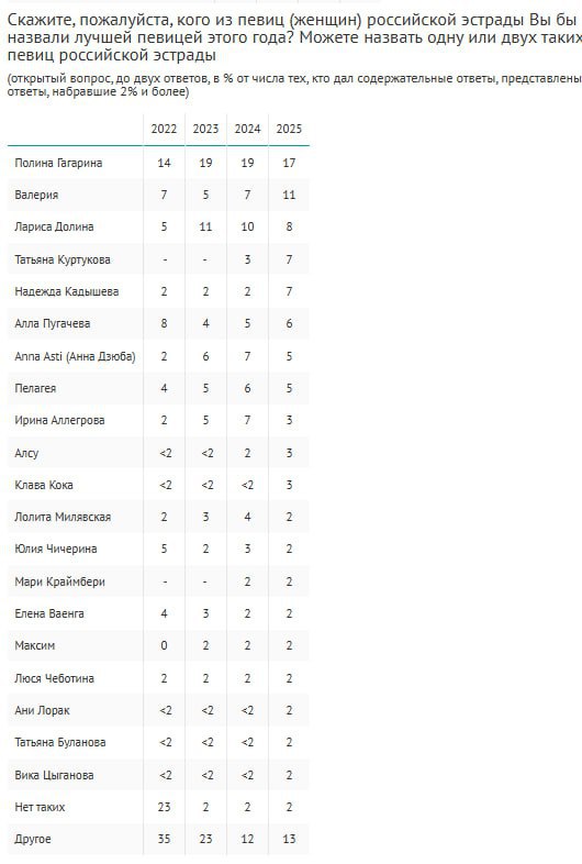 Shaman третий год подряд возглавил рейтинг лучших российских певцов, а Полину Гагарину признали лучшей исполнительницей года четвертый раз подряд, следует из опроса ВЦИОМ.