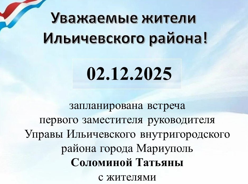 02.12.2025 г. запланирована встреча первого заместителя руководителя Управы Ильичевского внутригородского района города Мариуполь Соломиной Татьяны с жителями.