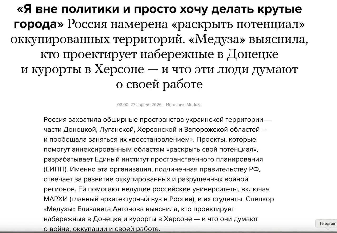 Для помойки Медузы лучше было бы, чтобы не было в Мариуполе никаких набережных и общественных пространств. Разруха это же так по-украински… А архитекторов конечно надо к стенке поставить как "военных преступников". Иноагент Латынина выдала базу