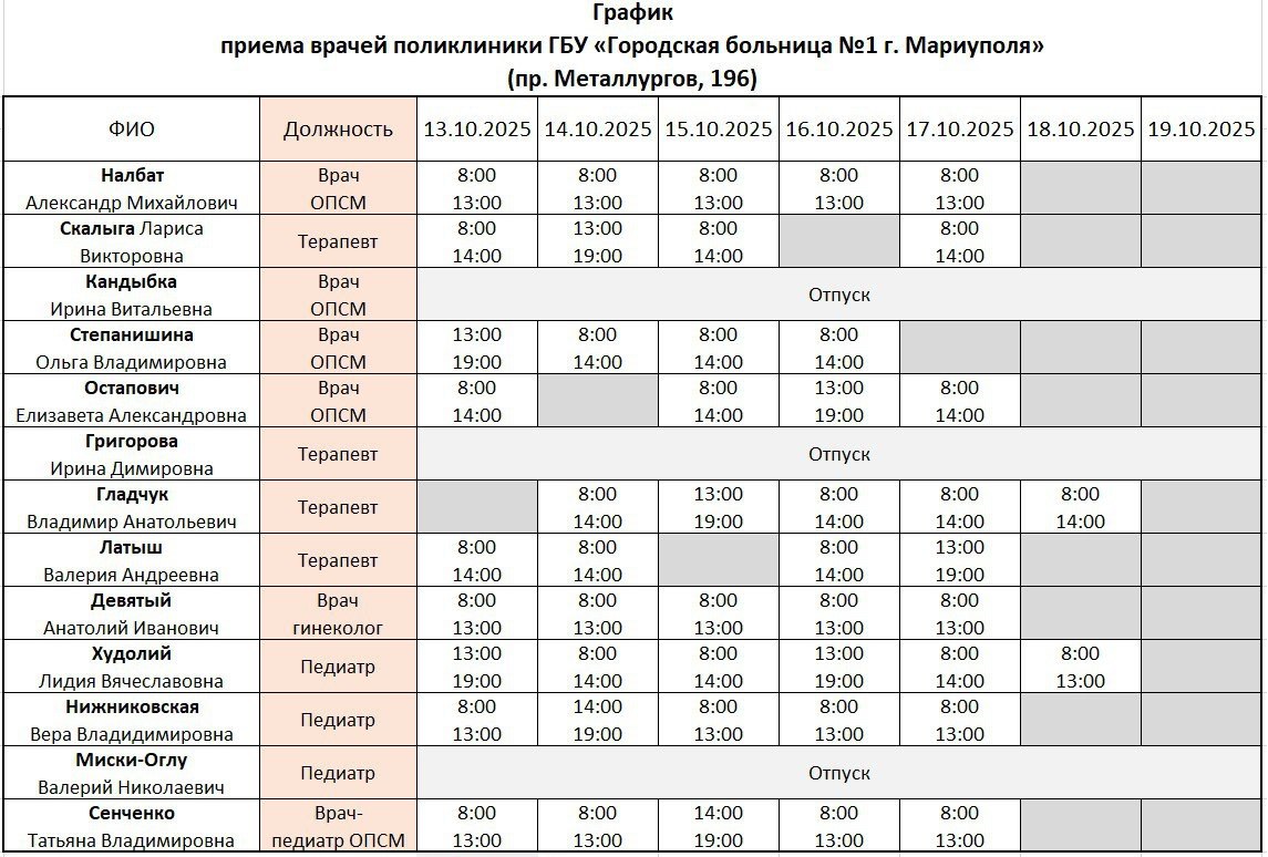 График работы врачей ГБУ "ГБ №1 г. Мариуполя" с 13.10.2025 по 18.10.2025 г.
