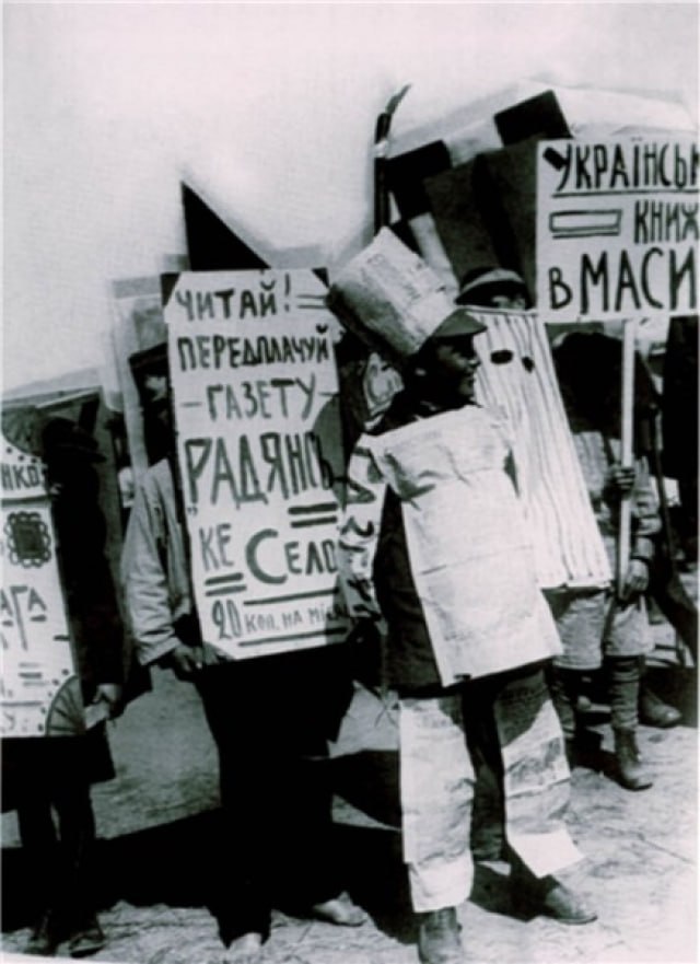 И дело «украинизации» пошло лучше: существовали даже «триады для украинизации», сотни комиссий с той же целью. Документы, вывески, газеты, журналы переводились на украинский язык, даже запретили говорить по-русски в государственных учреждениях. Использовались запугивание, административный террор.