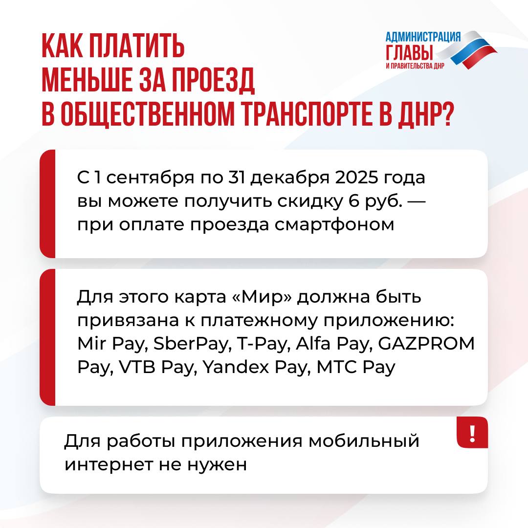 Чтобы получить скидку 6 рублей, нужно расплатиться в автобусах с валидаторами смартфоном, на котором установлен один из платежных сервисов: Mir Pay, SberPay, T-Pay, Alfa Pay, GAZPROM Pay, VTB Pay, Yandex Pay, МТС Pay.