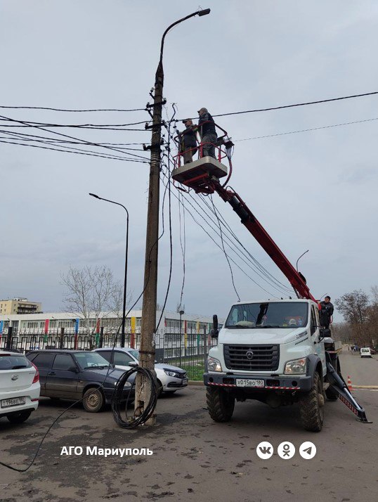 Вчера специалисты МУП «Мариупольгорсвет» приступили к установке и подключению тросов для праздничной иллюминации.