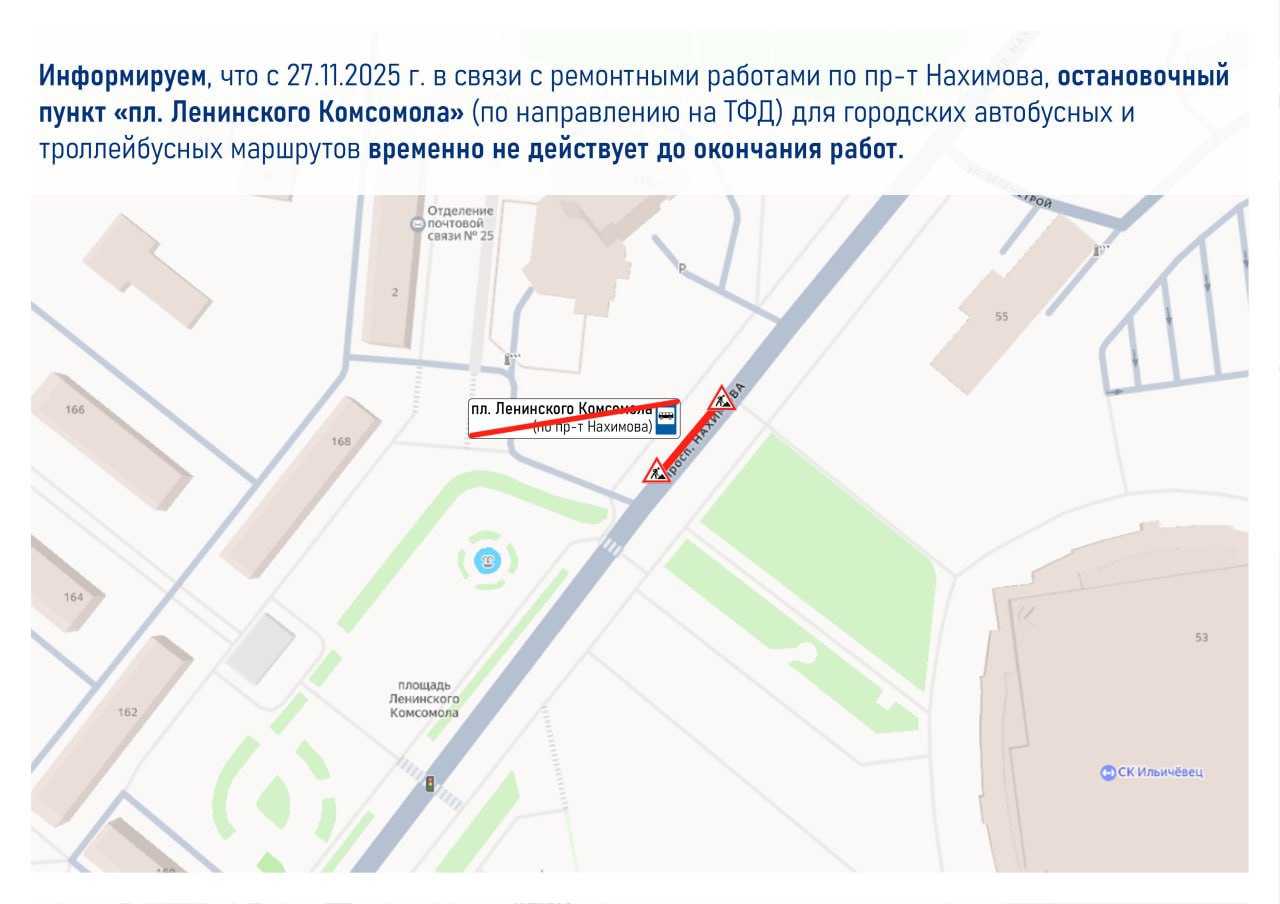 Информируем, что с 27.11.2025 г. в связи с ремонтными работами по пр-т Нахимова, остановочный пункт «пл. Ленинского Комсомола» (по направлению на ТФД) для городских автобусных и троллейбусных маршрутов временно не действует до окончания работ.