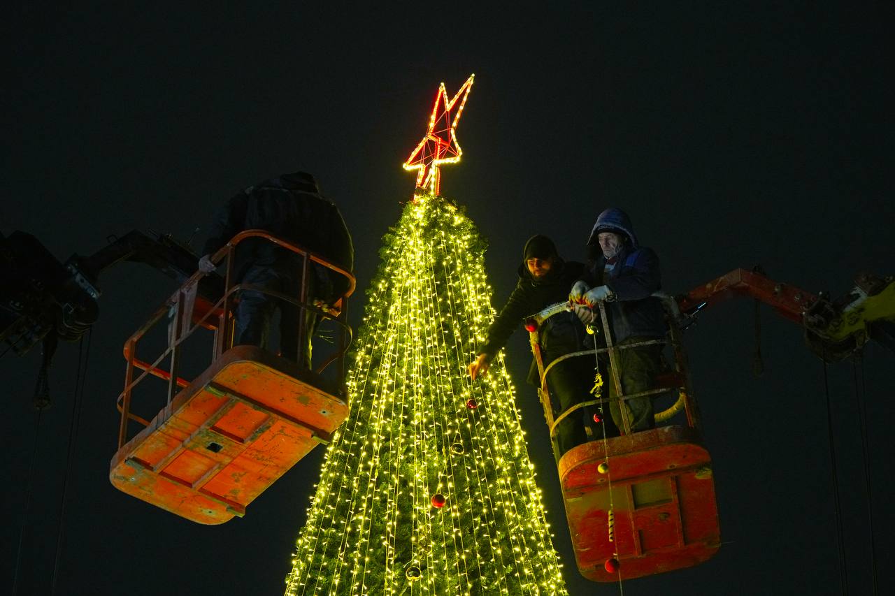 В Мариуполе сотрудники компании из Санкт-Петербурга приступили к финальному этапу украшения новогодней красавицы, установленной напротив драмтеатра. С её появлением в город вернулась традиция установки елки на этом месте.