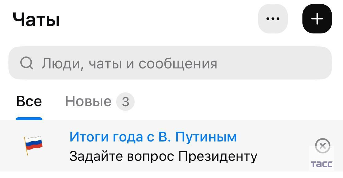 Мax предлагает россиянам быстрый способ задать вопрос Путину на прямую линию. Соответствующая плашка появляется в верхней части списка чатов.