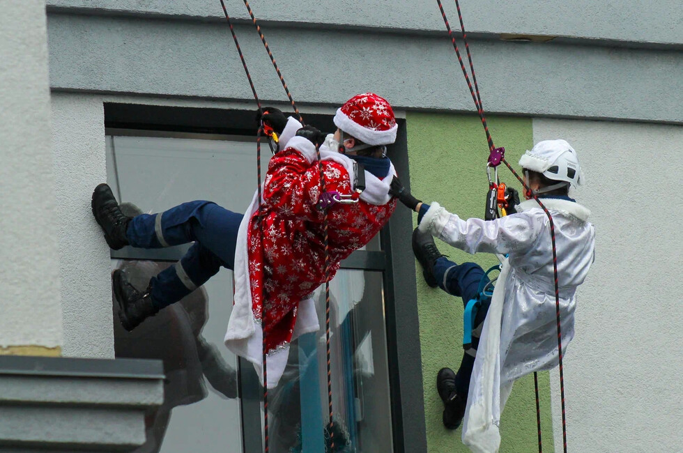 В прошлые годы акция проходила в Донецке, Харцызске и Амвросиевке, а теперь — еще и в Мариуполе. Студенты в костюмах Дедов Морозов и Снегурочек с помощью альпинистского снаряжения спускались с крыш детских больниц, а потом заходили в здания и общались с маленькими пациентами.