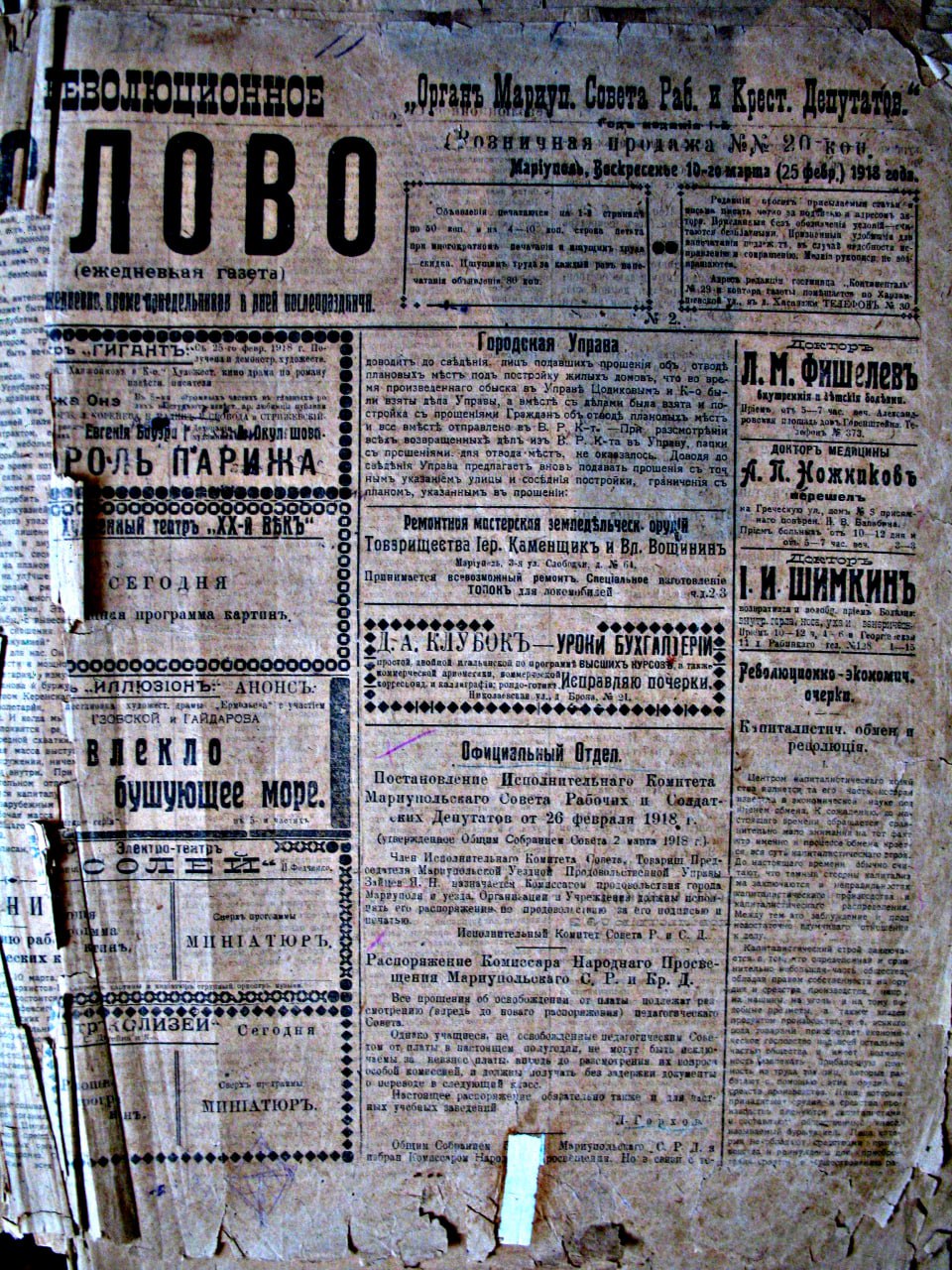 На фото – второй выпуск газеты «Революционное слово», от которой берет начало история «Приазовского рабочего». Первый выпуск, к сожалению, не сохранился, он вышел 9 марта 1918 года.
