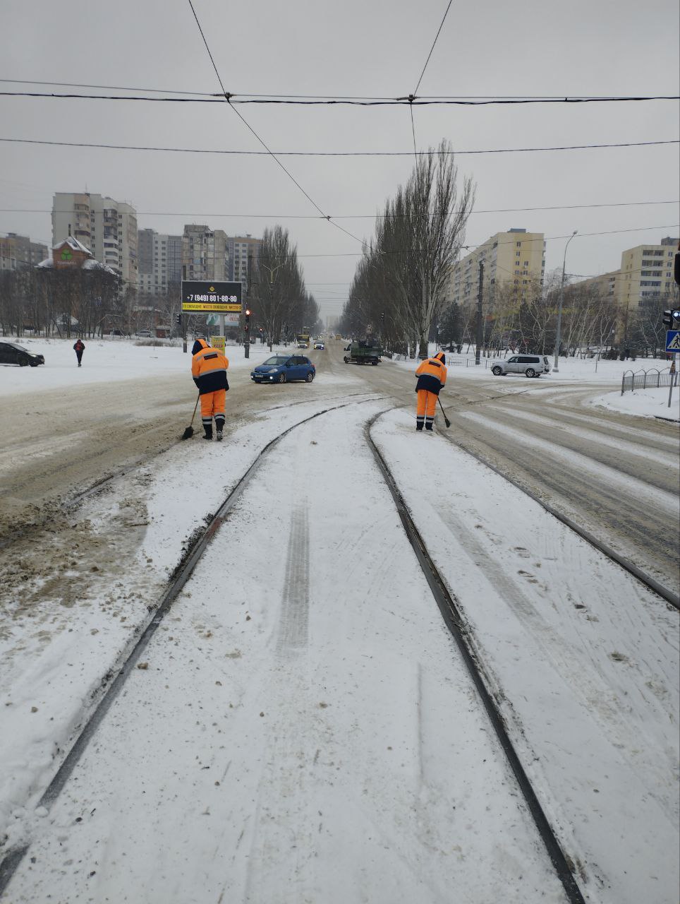 Мариупольтранс: Ежедневно сотрудники службы по обслуживанию и ремонту пути МУП « МАРИУПОЛЬТРАНС» выполняют очистку спецчастей трамвайного пути от снега, льда и грязи