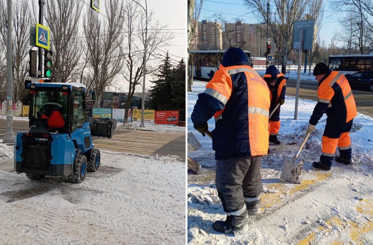 В пешеходных зонах вдоль проспектов Строителей и Металлургов сотрудники МУП «Мариупольавтодор» скалывают образовавшиеся снежные и ледяные наросты.