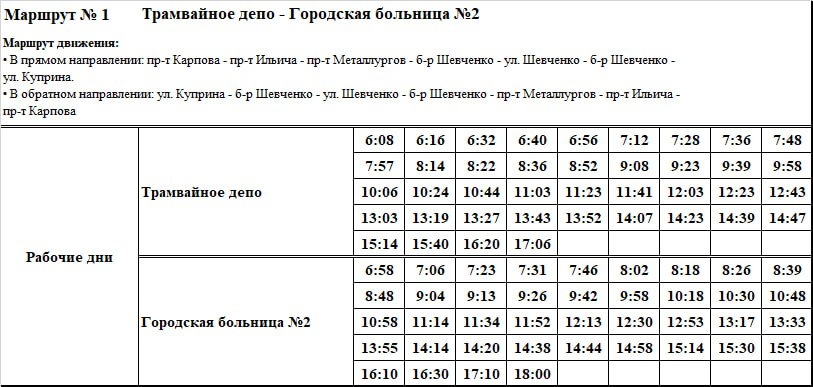 Актуальное расписание трамвайного маршрута №1 «Трамвайное депо - Городская больница №2» на 21.01.2026 г.