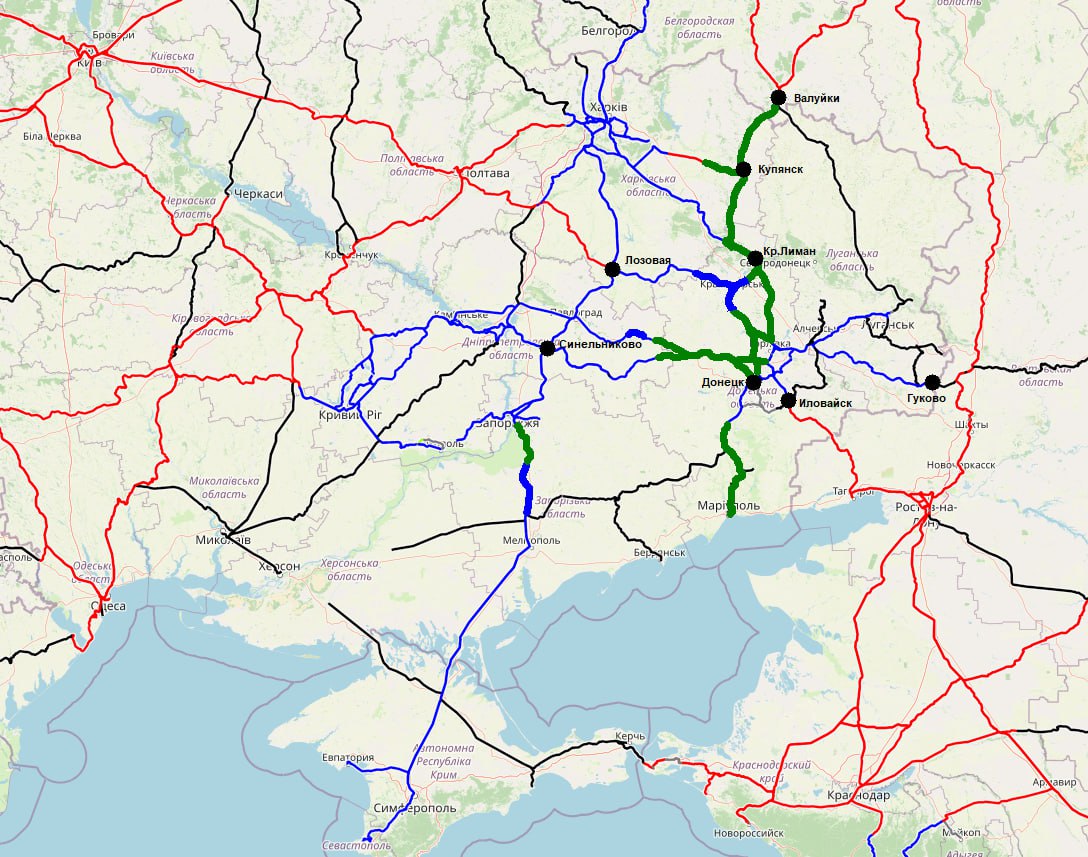 Но вот более восточный маршрут тоже по магистральной линии вполне возможен. Условно, Валуйки - Купянск - Красный Лиман - Северск - Горловка - Донецк - Волноваха и далее разветвление на Крым и Мариуполь. Правда, для этого придётся всё-таки овладеть Купянском, Святогорском и Красным Лиманом, где идут жестокие бои с переменным успехом. Ещё нужно будет превратить второстепенную тепловозную перемычку Волноваха - Федоровка в магистраль. Но и эффект будет велик: сокращение пути следования до Крыма часов на 8-10 от нынешнего уровня.