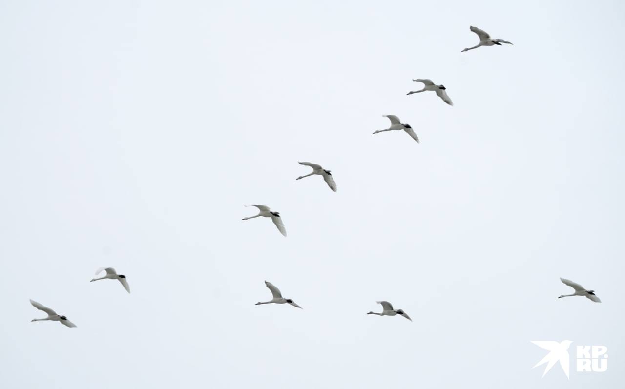 Стая лебедей в небе над Мариуполем летела красивым строем в форме буквы "V"