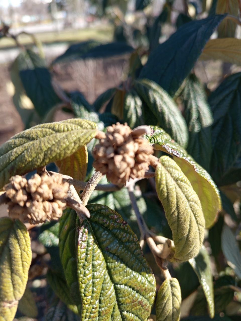 Флора нашего города. На этот раз объект наблюдения мы нашли в парке "Веселка". Это вечнозелёный кустарник калины морщинистолистной - выходец Азии, предположительно Западного и Центрального Китая. Узнать его можно по листьям - блестящим, утолщённым, шероховатым на ощупь с характерным рисунком "морщин".