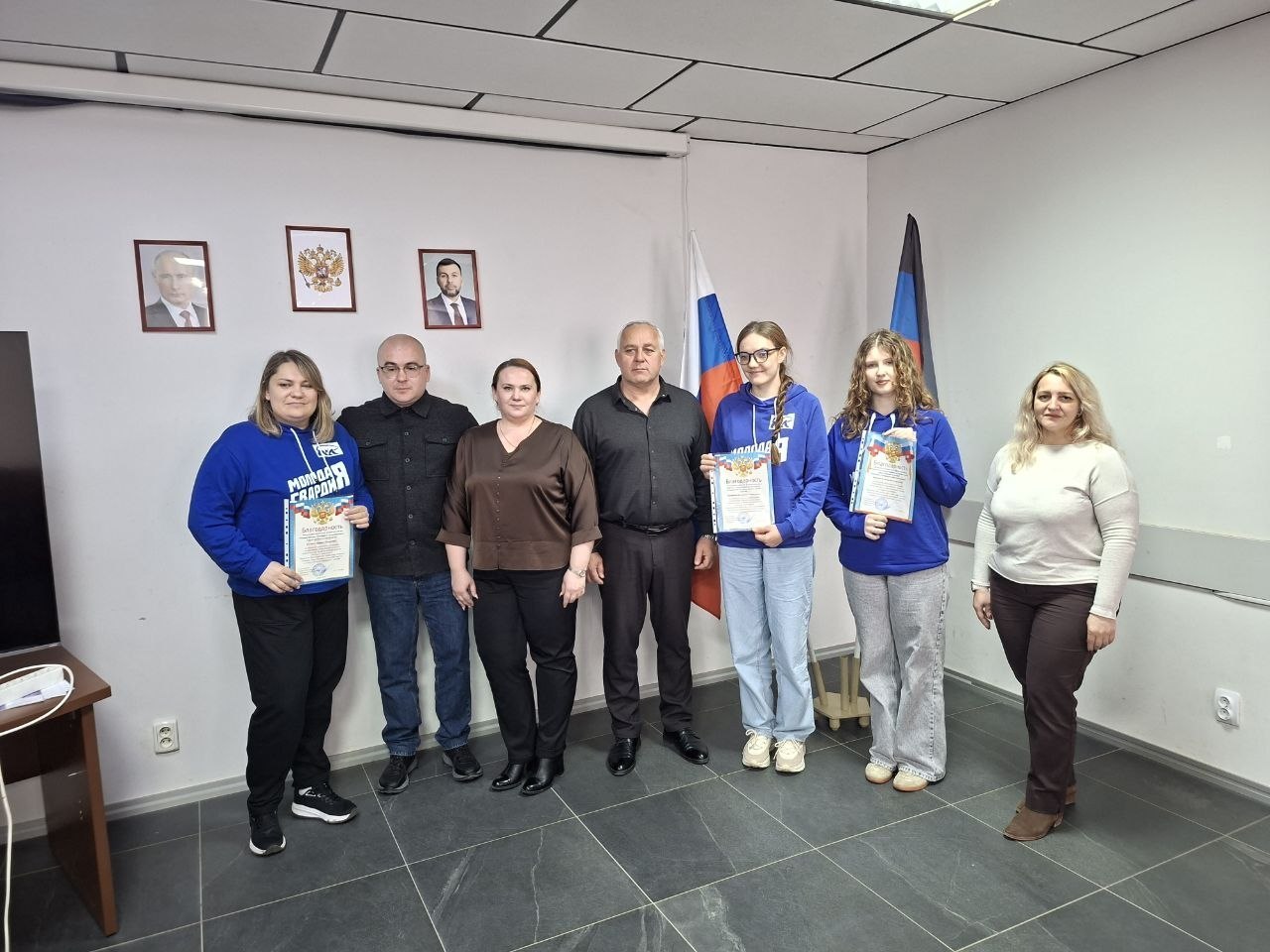 Руководитель Управы Ильичевского внутригородского района города Мариуполь Скударь Владимир совместно с заместителями руководителя Соломиной Татьяной и Малервейн Мариной, руководителем Мариупольского отделения «Молодой Гвардии» Аверкиным Никитой вручили благодарности Гусевой Марине, Нартовой Виктории, Закеевой Елизавете за: