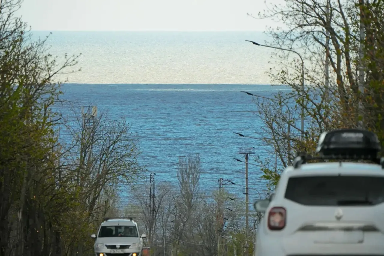 Плотные дождевые облака своей тенью разделили Азовское море в черте Мариуполя. Красивейший морской пейзаж приобрел необычные краски.