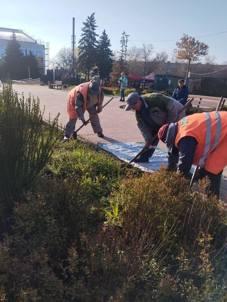Сотрудники МБУ «Зеленстрой» удаляют сорняки в зеленых зонах на площади у спорткомплекса «Нептун».