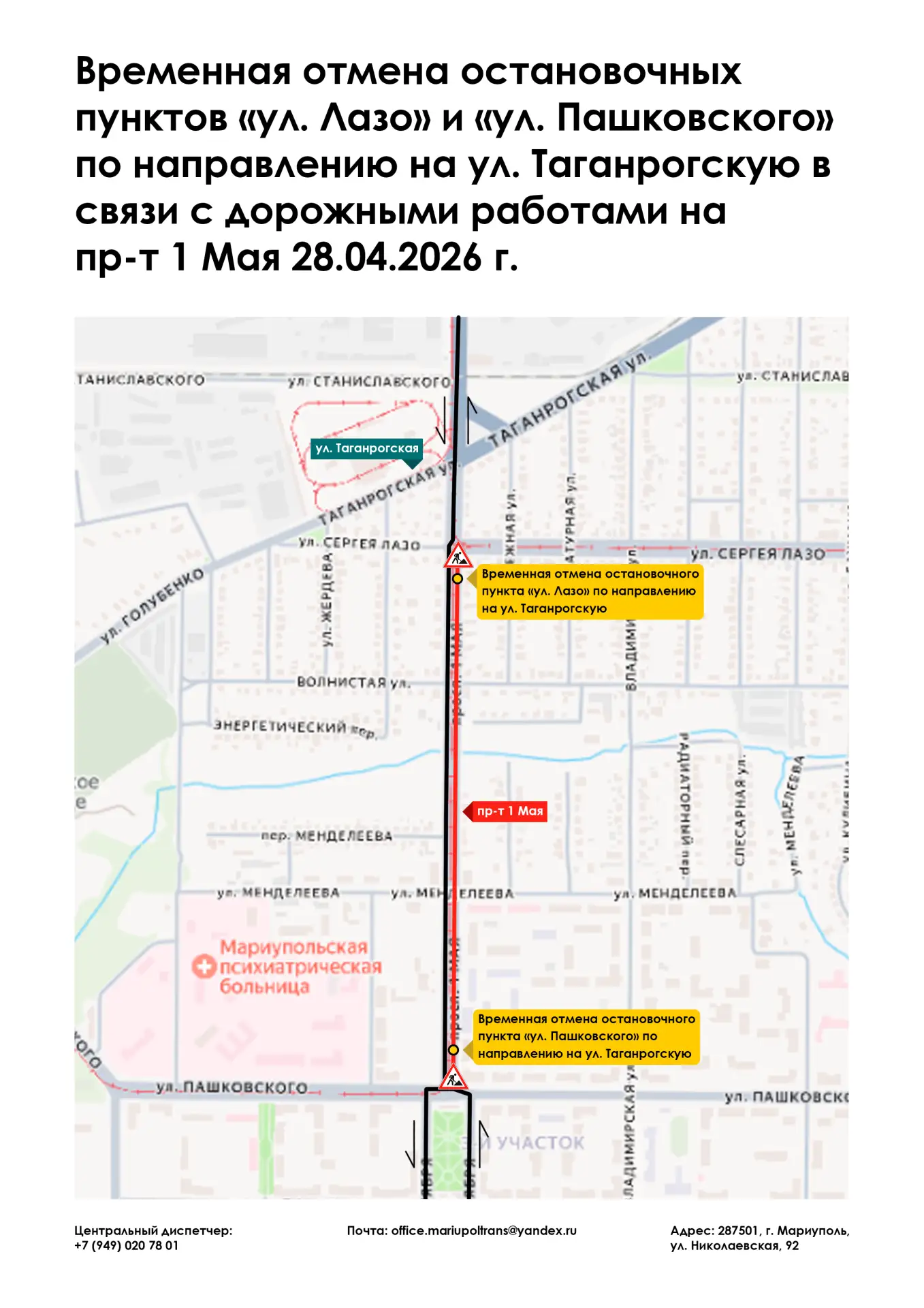 Информируем, что 28.04.2026 г. в связи с дорожными работами на пр-т 1 Мая, остановочные пункты «ул. Лазо» и «ул. Пашковского» по направлению на ул. Таганрогскую временно отменяются.Источник: ГУП ДНР "Мариупольтранс"МАХ | Telegram | Рутуб | ВК | OK |...