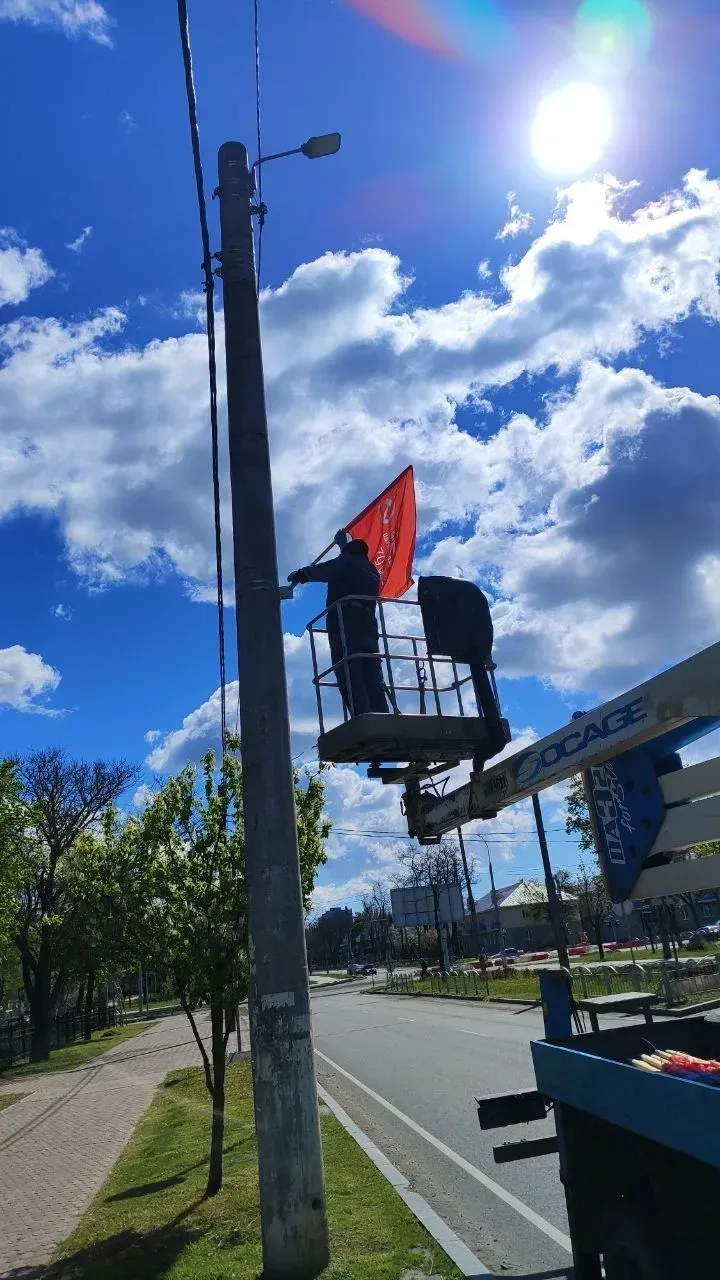 В преддверии 9 Мая и Дня Донецкой Народной Республики сотрудники МБУ «Мариупольгорсвет» украшают общественные пространства знаменами Победы, флагами Российской Федерации и ДНР.