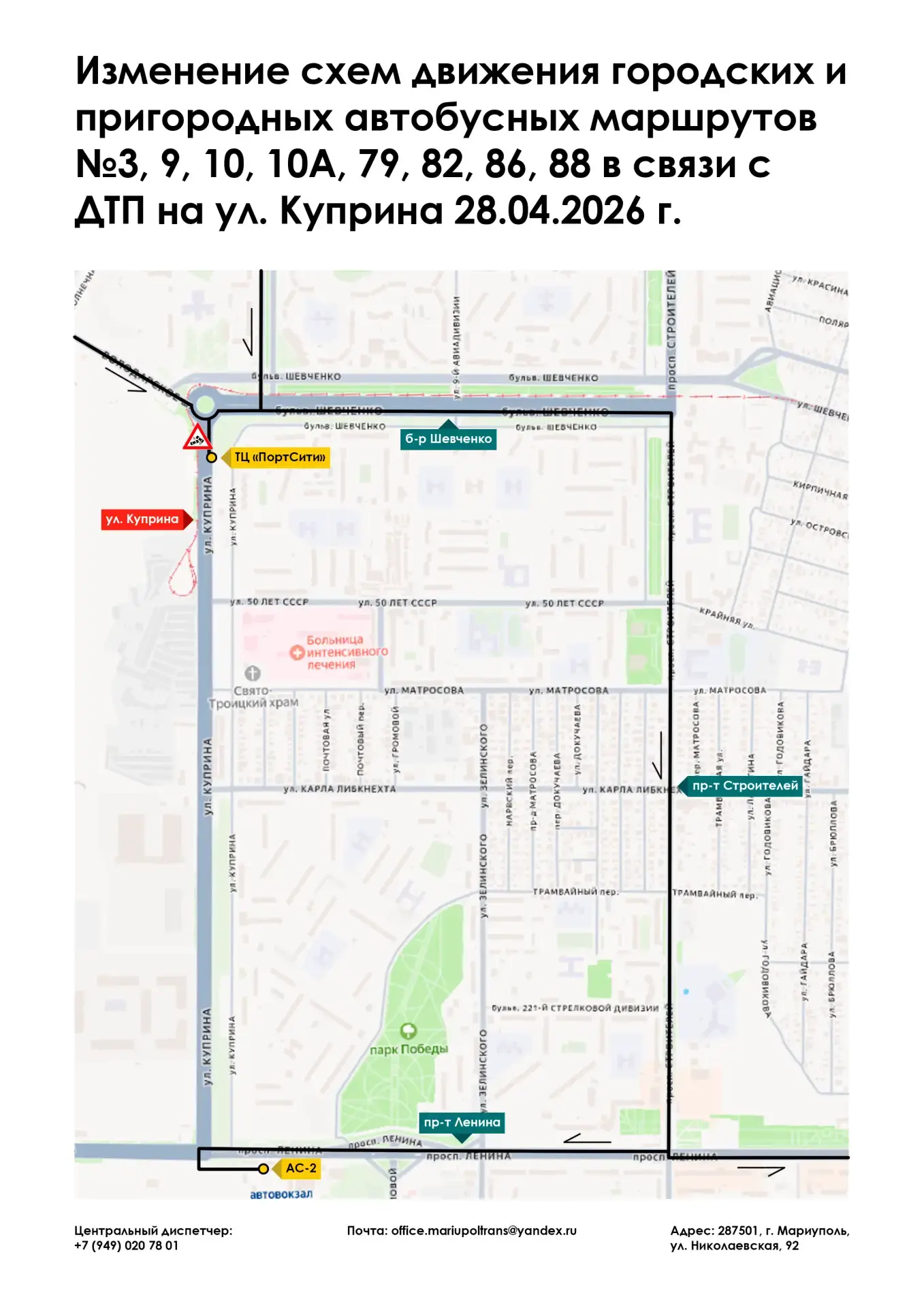 В связи с ДТП на ул. Куприна, следующие городские и пригородные автобусные маршруты 28.04.2026 г. изменяют схемы движения: