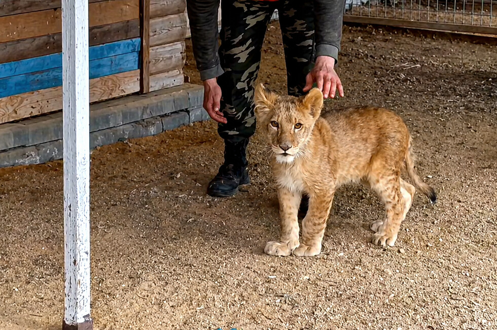 У львенка травмированы лапы, ветеринар прописал ему прогулки. Поэтому его регулярно выводят из вольера пройтись. Животное отличается хорошим аппетитом. Его кормят говядиной, курицей и хрящами, которые очень полезны в этом возрасте.