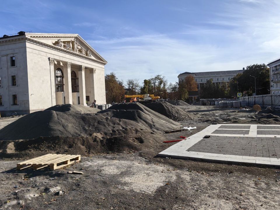 Этапы работ, требующие привлечения тяжёлой спецтехники, подходят к концу, не за горами благоустройство прилегающей к театру территорию.